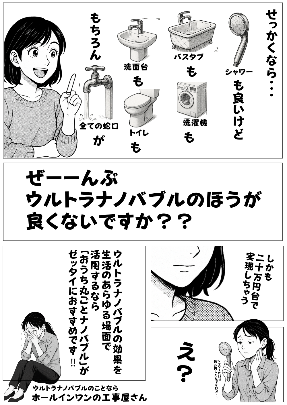 ご自宅に導入:以前から娘の敏感肌が気になっており、強力な洗剤で洗濯できなかったのですが、ウルトラナノバブル設置後は洗濯物に残留した洗剤も気にならなくなりました。もちろん汚れも落ちやすくなった気がします。入浴後も湯冷めしにくく、ポカポカが長続き。排水溝のヌメリも付かず、掃除の回数も減りました。設置工事もたった40分程度なので、みんなにお勧めしたいです。