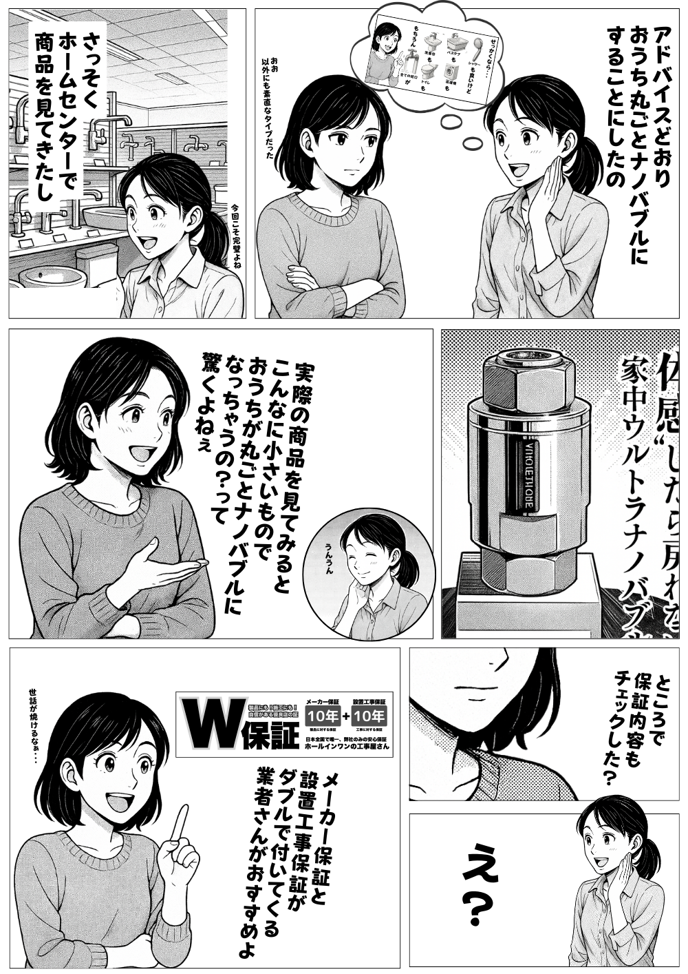 ウルトラナノバブル発生装置(ホールインワン製品)の取り付けの瑕疵や、設置工事に関わる施工不良について、弊社ホールインワンの工事屋さんが保証するものです。